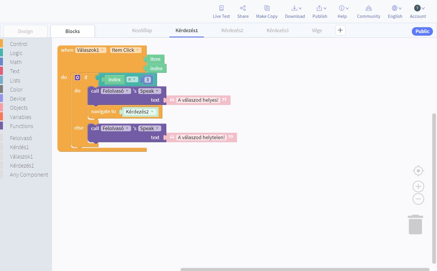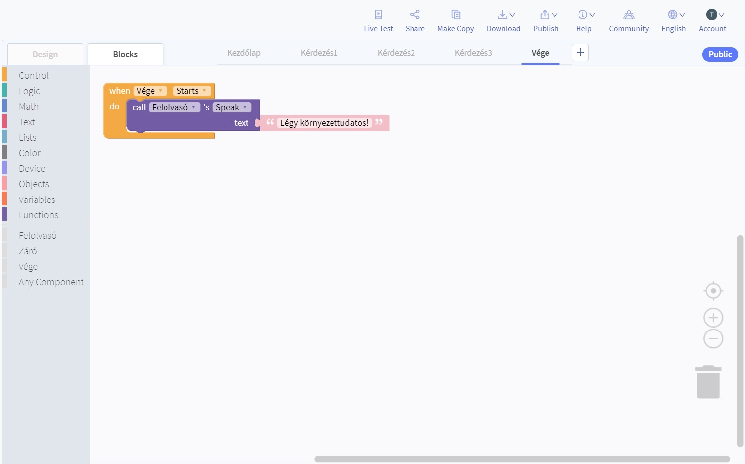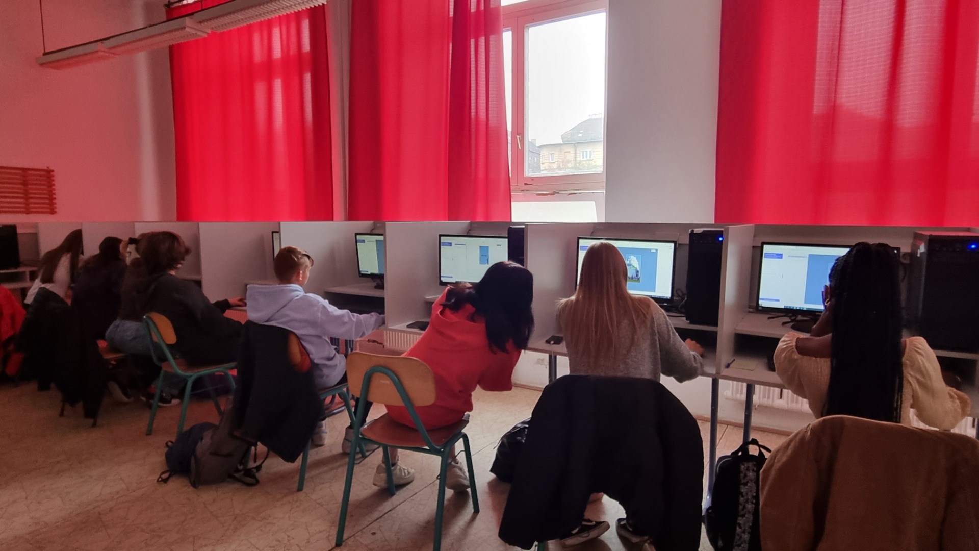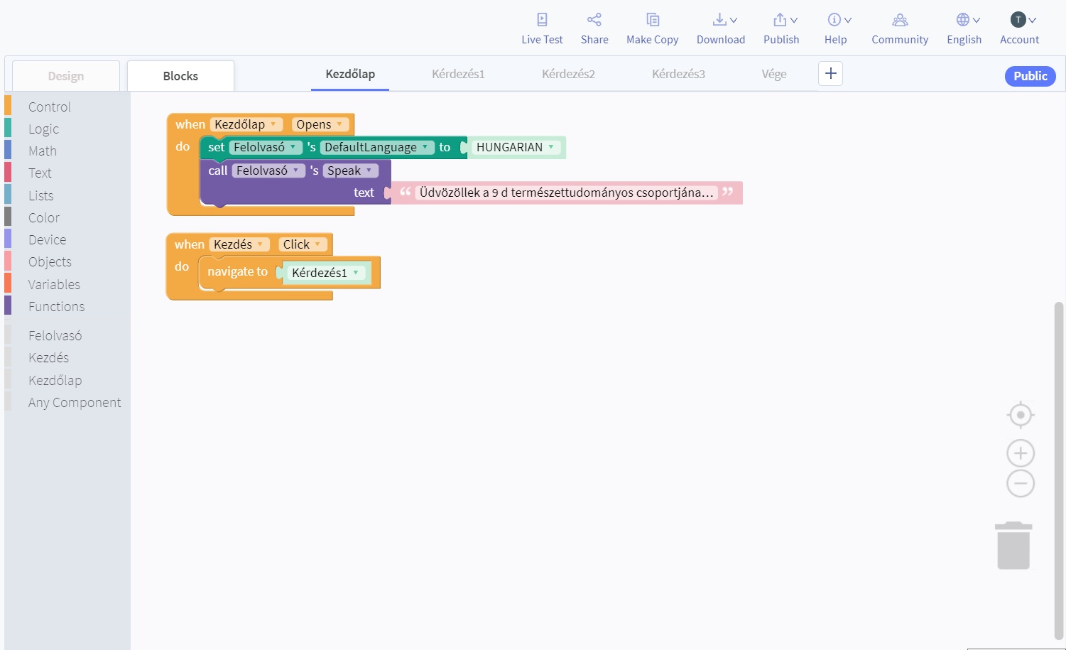 A 9. d osztály természettudomány tagozatos csoportja környezetvédelmi mobilapplikációt készített a Thunkable online blokkos mobilalkalmazás fejlesztő segítségével, amely 4 tanórát vett igénybe.